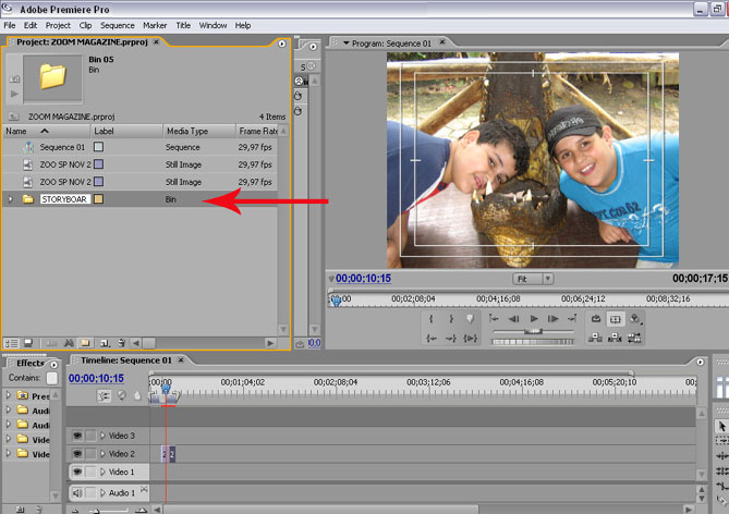Antes de importarmos os clipes selecionados, vamos criar um "BIN" para acomodarmos todos os clipes, ou seja, uma pasta para armazená-los. Embora este procedimento não seja obrigatório, é bastante importante para a organização do trabalho dentro do Premiere.