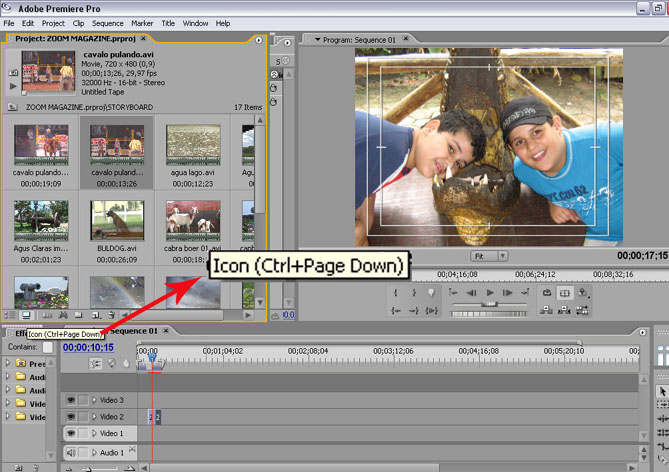 Agora, vamos alterar o modo de visualização dos ítens da janela Project. Do modo "lista", vamos passar a visualizar os clipes no modo "ícones" (ICON). Para isto, selecione o modo ICON no botão localizado na base da janela Project.