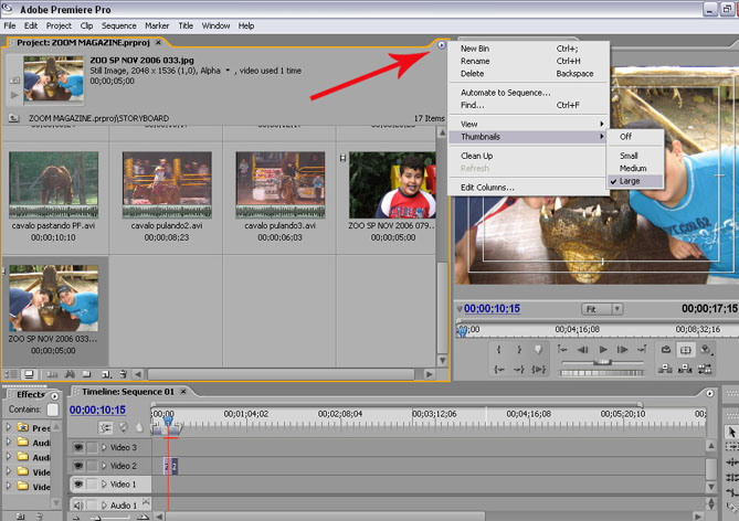 O próximo passo será organizar os clipes, dentro de uma ordem que você deseja. Para facilitar ainda mais a visualização dos ícones, é possível aumentá-los de tamanho. Clique no menu oculto da janela Project, vá em THUMBNAILS / LARGE.