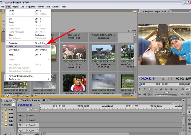 Primeiro posicione o leitor de imagens no início da timeline, ou no local onde você deseja que os clipes sejam instalados (na timeline). Vá em EDIT e em SELECT ALL para selecionar todos os clipes.