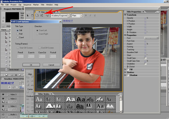 Dentro do TITLE vamos configurar os controles para que o texto não se mova, ou seja, fique em STILL.Para isto, vamos entrar em ROLL/CRAWLL OPTION e escolher a opção STILL.