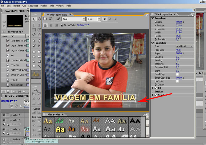 Feito isto, vamos levá-lo para a Timeline e posicioná-lo na trilha de vídeo acima do vídeo ou foto em questão. Lembre-se de que a qualquer momento este title pode ser reeditado, alterando-se qualquer item de sua construção.