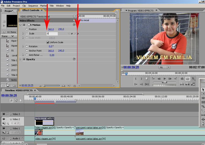 Vamos então fazer com que o texto cresça, a partir do zero, e depois de ficar em seu tamanho normal, ele saia para a direita da tela. O primeiro passo da configuração é em SCALE, onde vamos determinar Keyframes para o crescimento do texto. No frame inicial do vídeo marcaremos um Keyframe de SCALE e determinaremos 0.