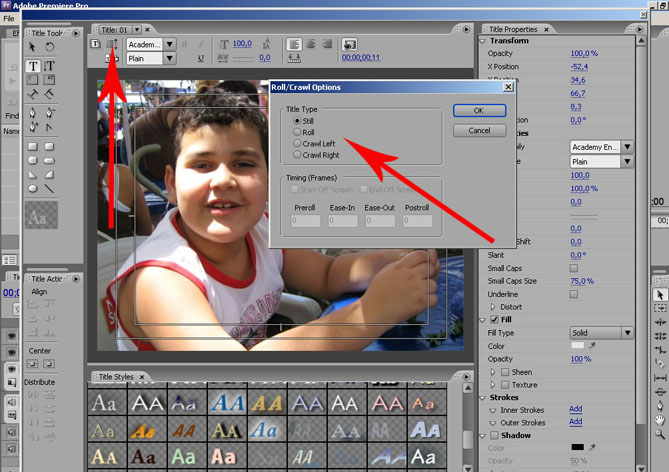 Como você poderá observar, agora existem mais opções de ferramentas, tanto para a criação de textos como para desenhos. O local no qual é possível escolher se o texto a ser inserido ficará parado, ou em movimentos de roll (vertical) ou de crawl (horizontal), mudou. Em um único acesso consegue-se determinar qual o tipo de texto e, ainda, há a possibilidade de iniciar a movimentação fora da tela (Start off Screen) e terminar fora dela (End off Screen), como mostra a figura abaixo: