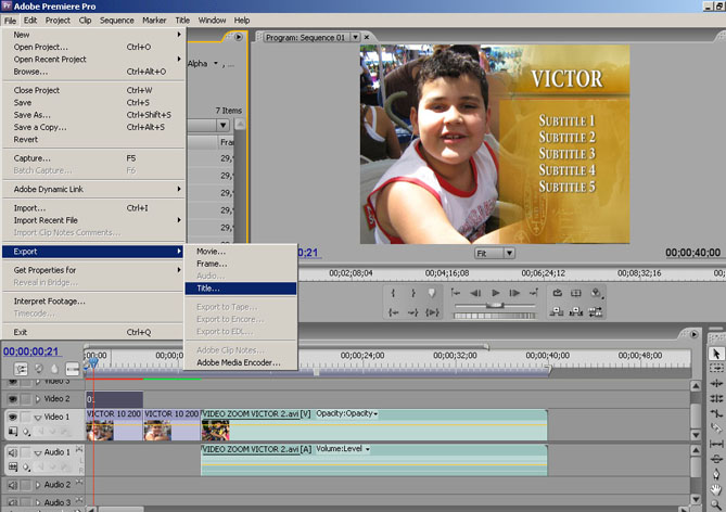 Para aplicar o texto na timeline não é mais preciso salvá-lo. Basta fechá-lo e ele, automaticamente, se localizará na janela Project. De lá, é só arrastá-lo para a posição desejada na timeline e pronto. Se houver necessidade de utilizá-lo em outros lugares fora do projeto onde foi criado, basta exportá-lo, utilizando FILE EXPORT / TITLE. Depois, é só importá-lo para outro projeto: