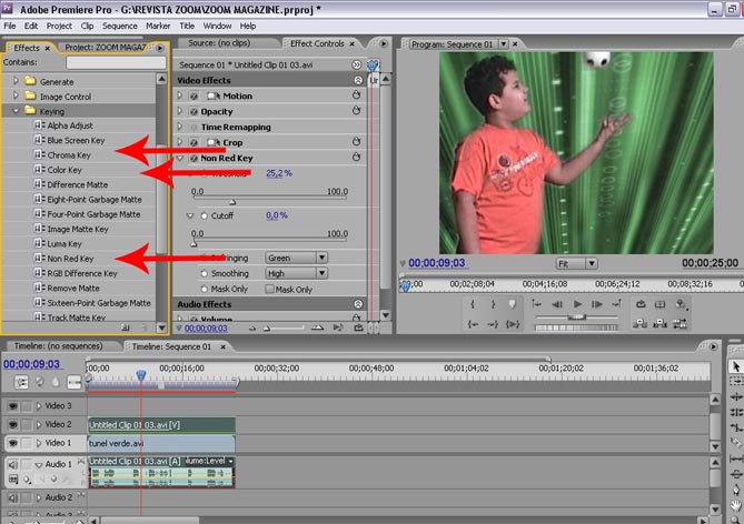 O próximo passo é aplicar o efeito determinado. Há algumas opções no painel de Video Effects que podem fazer o recorte. É importante testar as várias opões e escolher a que apresentará melhor resultado. Em Video Effects, vamos à pasta Keying, na qual estão localizados os efeitos de recorte. Para fazer o recorte do verde, podemos optar pelo efeito de chromakey, pelo “Colorkey” e até mesmo pelo “Non Red Key”. Se o fundo for azul, além destes, também é possível utilizar o “Blue Screen Key”:
