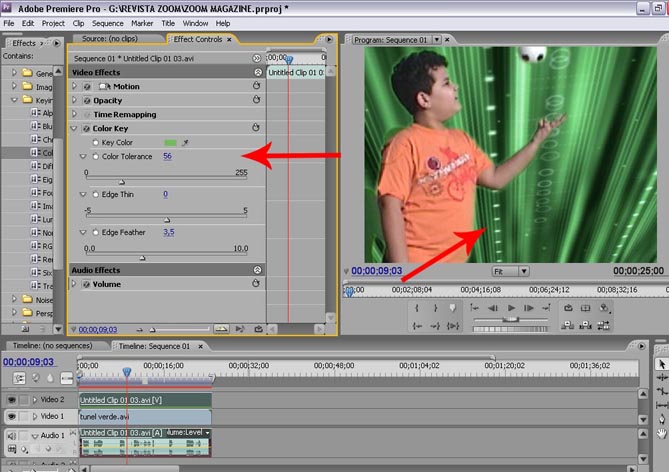 Após a aplicação do efeito, efetuaremos as regulagens no painel Effect Controls. Com o conta-gotas, selecione a cor que será recortada – em nosso caso, o verde. O próximo passo é configurar o efeito através dos parâmetros Color Tolerance para efetuar o recorte e, em Edge Tin e Edge Feather, para realizar um melhor acabamento do mesmo. Faça várias combinações de regulagens entre estes parâmetros para tentar obter o melhor resultado:
