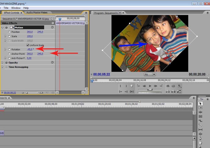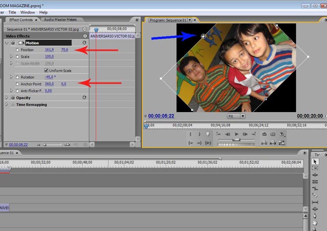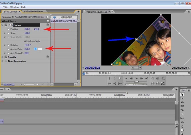 Note que, primeira figura o valor de “Rotation” é 0º - e na seguinte, 45º. O valor de Anchor Point é exatamente a metade do seu tamanho, ou seja: o centro da imagem. A rotação da imagem se altera e o Anchor Point continua no mesmo lugar, não alterando seu valor.