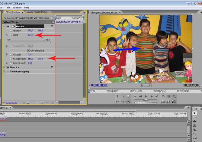Agora, vamos utilizar como exemplo o trabalho com a escala (“Scale”). Se o Anchor Point estiver localizado no centro da imagem, a escala terá como referência este ponto, para diminuir ou aumentar a imagem. A diminuição ou aumento da imagem sempre partirá do centro, ou seja, deste valor de Anchor Point:
