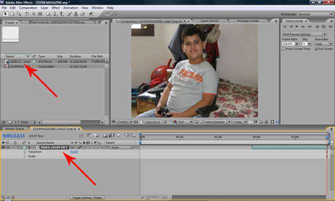 O vídeo levado para o After está em uma composição. Note que até o tempo de duração da composição é igual ao total de vídeos que estão dentro da seqüência do Premiere:
