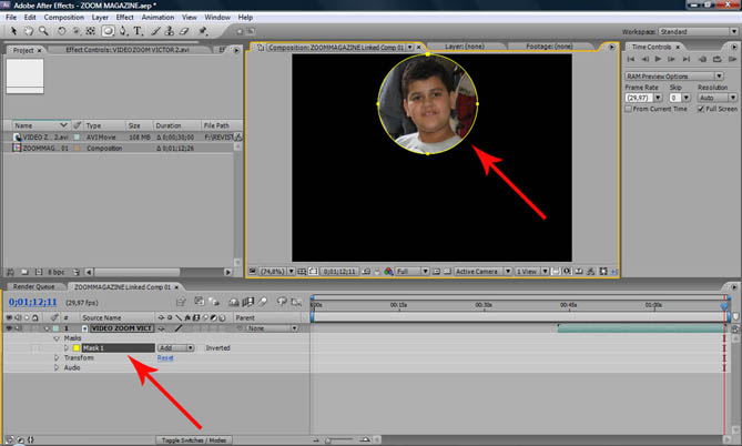 Agora, faremos uma modificação no vídeo dentro do After Effects. Criaremos uma máscara circular dentro do clipe: