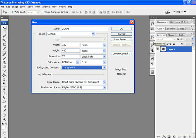 O primeiro passo é criar a logomarca no Adobe Photoshop, para, só então, levá-la ao Premiere. Para facilitar o trabalho na hora de editar, vamos preparar uma nova tela no Photoshop com as dimensões apropriadas para o Premiere Pro. Neste caso, abriremos uma tela com as seguintes características: frame size: 720 x 480 e pixel aspect ratio: D1/DV NTSC (0,9), como mostra a figura abaixo: