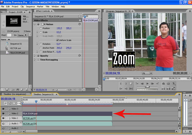 Note que a imagem entra com seu fundo totalmente transparente. Agora, através do MOTION do Premiere, acomodaremos a imagem no local desejado. Se for necessário, também é possível mexer no tamanho da imagem. Faremos essas alterações através do POSITION e do SCALE do MOTION: