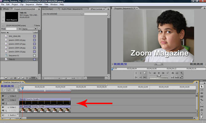 Feito isto, o próximo passo é posicionar o Title na Timeline, sobre um vídeo ou foto. Nesse caso, posicionaremos o Title na trilha de Vídeo 2, sobre uma foto que está na trilha de vídeo 1. É importante acomodar o Title sobre a foto, de modo que ocupe o tempo desejado para a exibição: