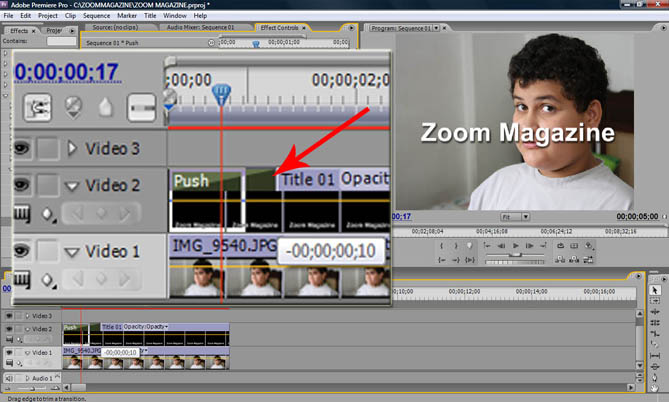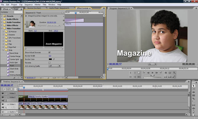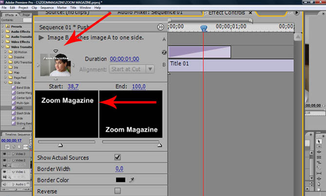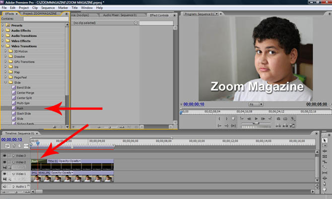 Vamos agora aplicar um efeito de transição para animar o texto. Na paleta “Effects”, temos a pasta “Video Transitions”, onde escolheremos um efeito de transição. Utilizaremos o “Push”, que está dentro da pasta “Slide”. Este efeito faz com que o texto se movimente entrando ou saindo da tela. Para aplicá-lo, basta arrastá-lo para cima do texto. Acomode-o bem no início do clipe do texto: