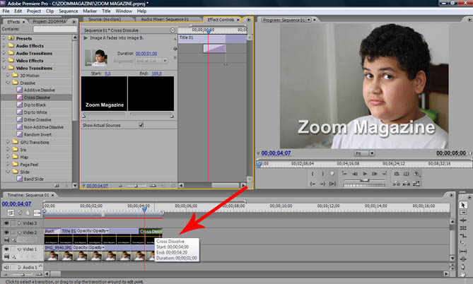 Desse modo, está feita a animação para a entrada do texto. Para fazê-lo sair, basta repetir todo o procedimento com o efeito de transição – só que, agora, bem no final do clipe do texto. É possível utilizar um grande número de efeitos de transição para esse tipo de animação. Experimente-os e faça suas próprias combinações.