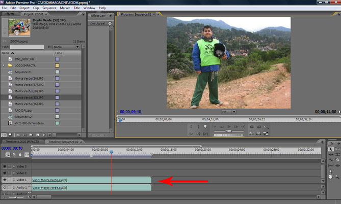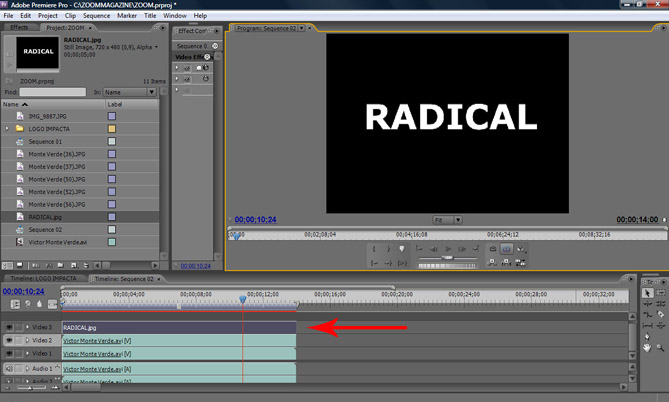 O primeiro passo é adicionar à trilha “Vídeo 1” a primeira imagem: