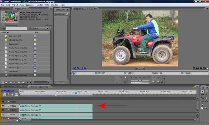 Agora, vamos colocar outro vídeo na trilha “Vídeo 2”. Estes vídeos vão-se combinar para que um fique dentro da figura produzida no Photoshop, enquanto a outra imagem permanece no fundo: