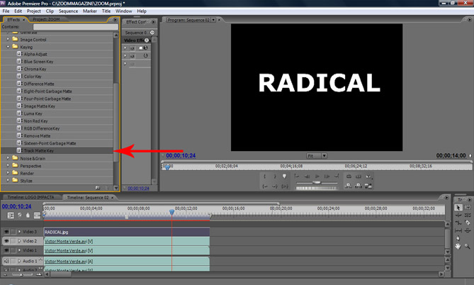 Após colocarmos todas as imagens em suas respectivas trilhas de vídeo, vamos à janela “Effects” para selecionarmos o efeito desejado. Dentro desta janela, vamos até “Video Effects” e, na pasta “Keying”, escolhemos o efeito “Track Matte Key”: