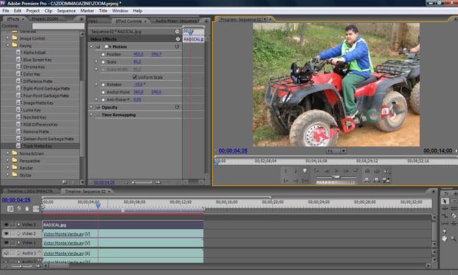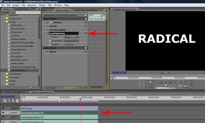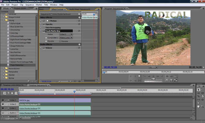 Dentro da janela “Effect Controls”, vamos estabelecer o parâmetro “Matte”, onde a trilha “Vídeo 3” será selecionada para que a imagem possa ser combinada com as demais. Veja o resultado: