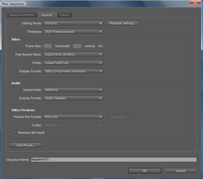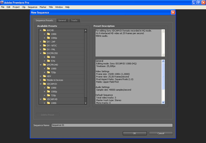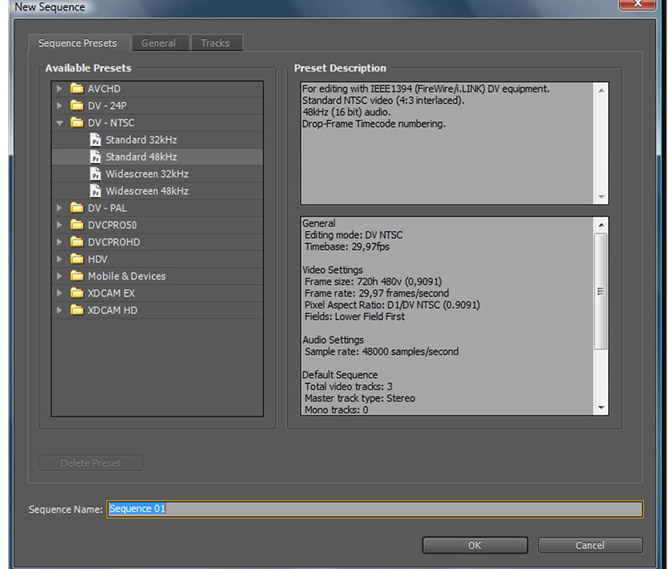 Escolhidas a maneira e as características de abertura do projeto, o próximo passo é determinar as características da sequência, como o número de trilhas de vídeo e áudio e suas especificações: