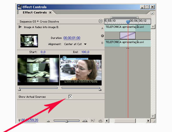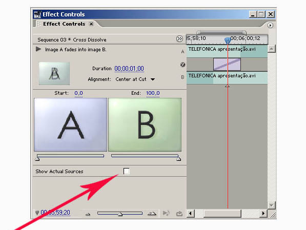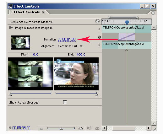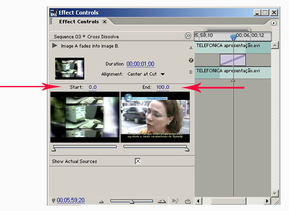 É importante ressaltar que acima dos quadros das imagens existe o percentual de aplicação de cada imagem.Para que o efeito de transição seja perfeitamente aplicado é necessário que o seu início (Start) esteja em 0% e seu final (End) esteja em 100%. Esta diferença de percentual é exatamente o “percurso” que o efeito de transição realiza, determinando assim o efeito escolhido.