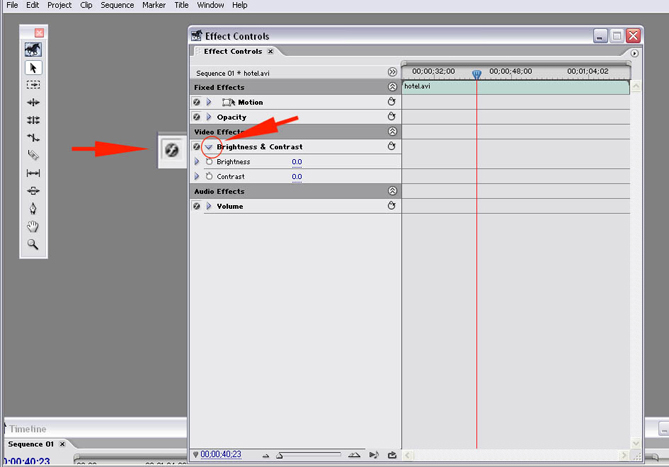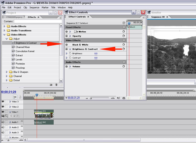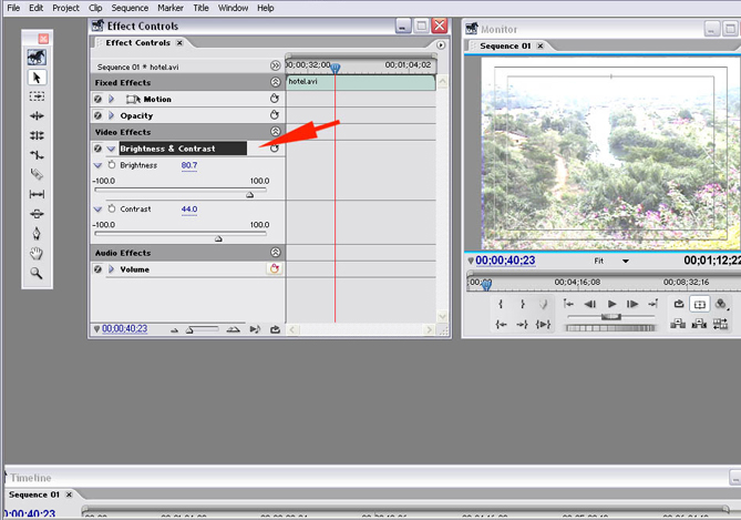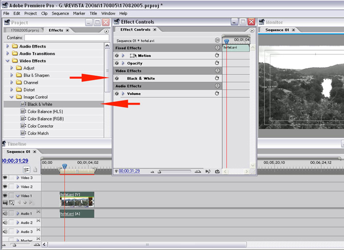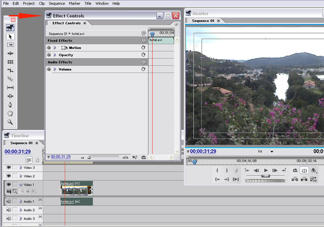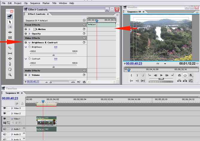 Nesta hora , é importante que você deixe a sua área de trabalho (Work Area) de maneira que sejam visualizados, ao mesmo tempo, a paleta Effect Controls e o Monitor, no mínimo.Isto é importante para que se possa analisar e graduar, se necessário os resultados do efeito aplicado.
