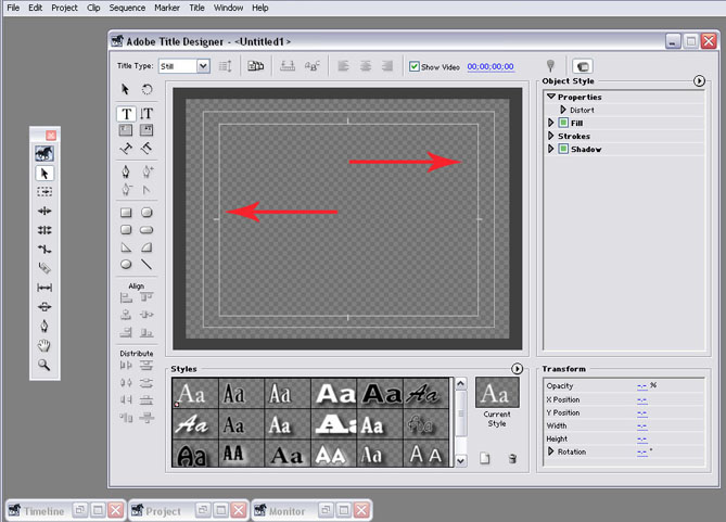 Para a configuração destes elementos você deve acessar a área OBJECT STYLE, localizada na parte direita do Title. Nesta janela as configurações podem ser determinadas exclusivamente para cada item que você criar dentro do title.