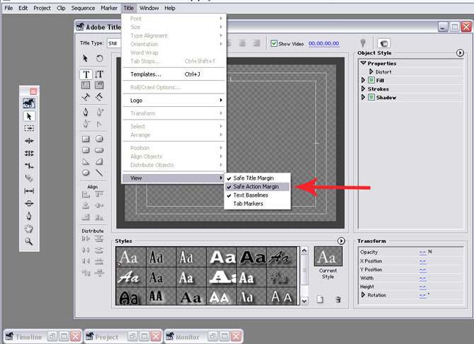 Para habilitar a área de segurança dentro do Title Designer, selecione TITLE / VIEW / SAFE ACTION MARGIN: