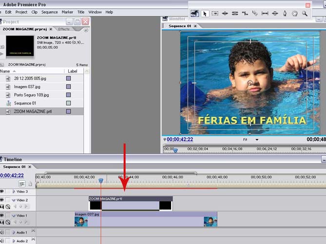 Primeiro vamos construir um texto dentro do Title Designer, em Still, ou seja, sem movimentação de roll, ou crawl. O texto é posicionado no centro da tela do vídeo. Feito isto, vamos posicionar o title na timeline, exatamente sobre a trilha de vídeo onde está localizado o vídeo a ser legendado.