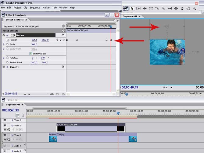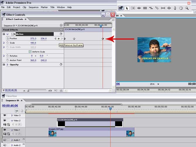 Como dissemos, esta legenda ficará durante 3 segundos dentro da área de visualização, então, vamos determinar os 3 segundos marcando um novo Keyframe de Position, a 3 segundos do anterior, sem mudar as suas configurações.