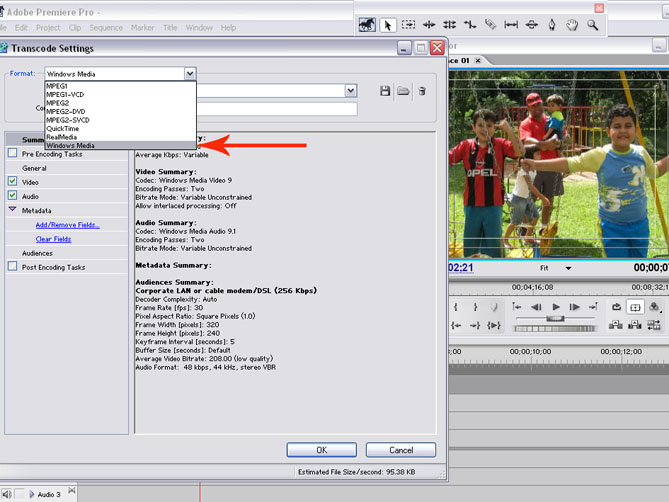 Vamos escolher a opção WINDOWS MEDIA. O Windows Media tem se mostrado uma boa opção de arquivos para Internet.