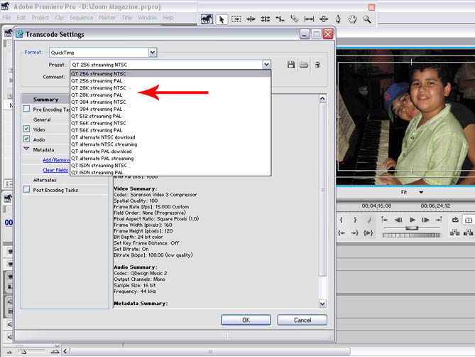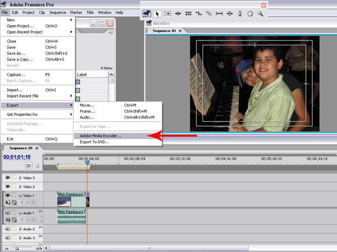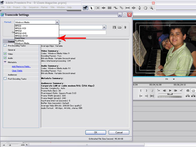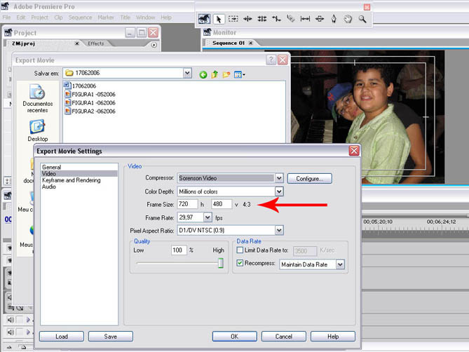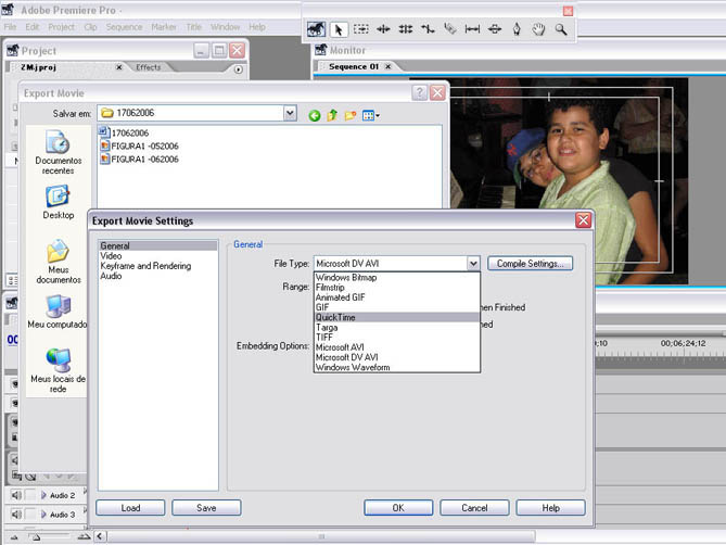 A próxima opção de exportação em Quick Time se destina a gerar arquivos menores, mais apropriados para a Internet, por exemplo. Vá a FILE / EXPORT / ADOBE MEDIA ENCODER. E depois entre em FORMAT. Lá, dentre outros formatos estará o Quick Time.