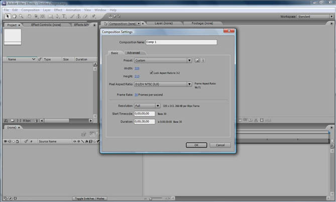 Para entendermos o trabalho dentro do After Effects podemos comparar alguns de seus detalhes técnicos com os de um programa de edição, como o Adobe Premiere. Quando editamos, precisamos trabalhar em uma área de visualização coerente com o tamanho da imagem que foi captada nas gravações; e também, de acordo com o formato em que esta será exibida. Por exemplo: em uma TV (nesse momento não vamos considerar um modelo HD). O tamanho de uma imagem gravada no sistema NTSC é de 720 x 480. Por isso a edição também deve ser feita baseada em uma tela com essas dimensões.Dentro do After Effects, não é preciso trabalhar necessariamente com estas dimensões. Explicando melhor: muitas vezes, produziremos um material ao qual se adicionará a edição. E este material pode ser menor que a tela da TV, como uma logomarca que será adicionada à tela como se fosse uma marca d’água, por exemplo.