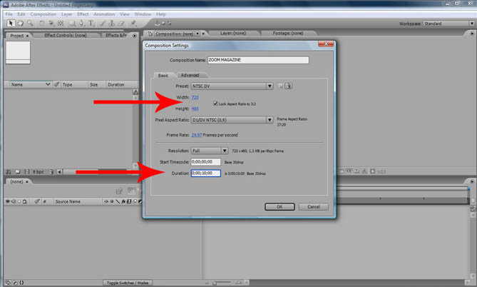 Em Composition Settings determinamos quais serão estas características. É perfeitamente possível (e bastante comum) criarmos diversas compositions dentro de um mesmo projeto. Neste exemplo, utilizaremos as mesmas características de um vídeo que foi editado, ou seja: tamanho de tela de 720 x 480 com um frame rate de 29,97 f/s. É importante determinar, também, o tempo de duração do trabalho que será feito. Diferentemente da edição, na qual já temos uma Timeline – e nela são adicionados materiais como vídeos e áudios –, no After Effects é correto criar a composition sempre de acordo com o tempo de duração da animação: