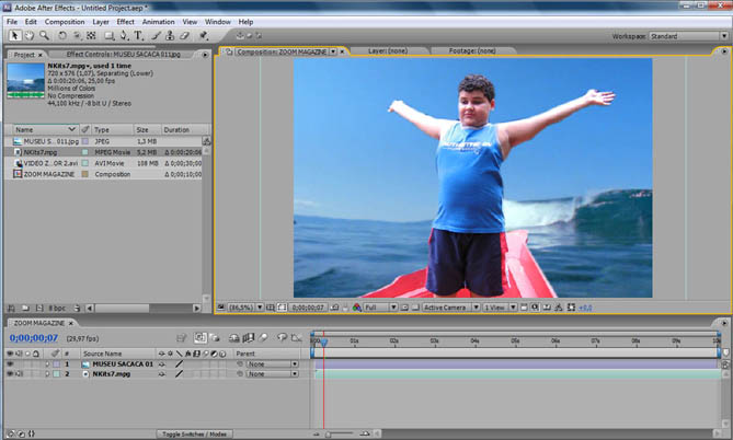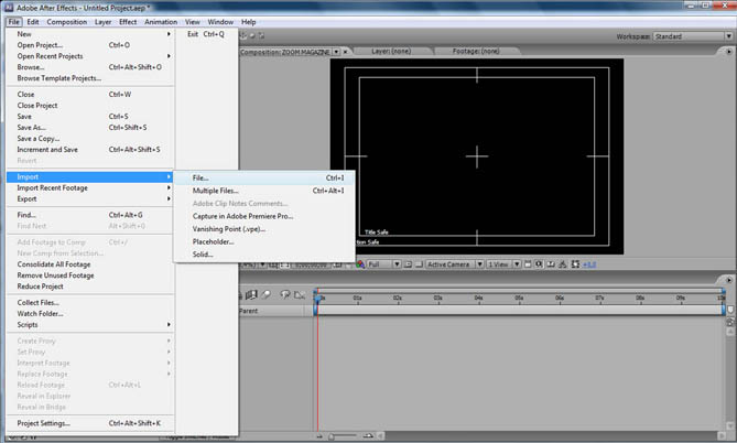 Criada a composição, podemos dar início a qualquer trabalho. Se quisermos manipular ou alterar um vídeo ou foto, é hora de importarmos este material. A importação é feita como em qualquer outro programa: File / Import / File: