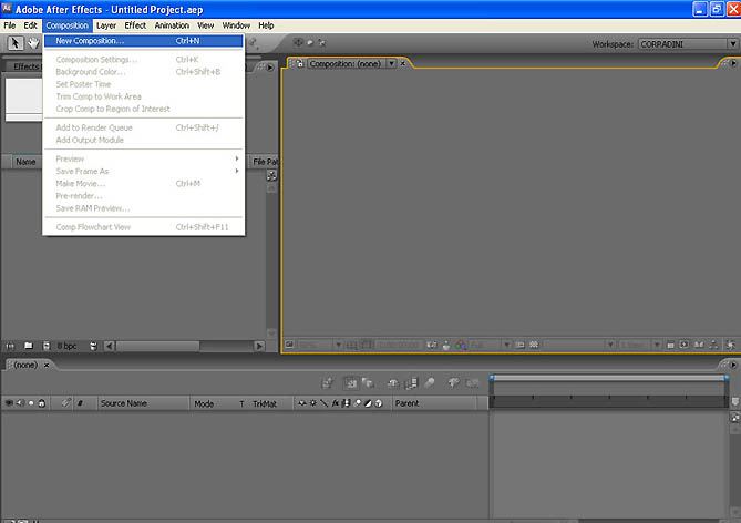 No After Effects, tudo começa a partir da criação de uma nova composição (composition), na qual são criadas as animações ou efeitos. Esta composição deve ter o tamanho programado – seja para a exibição de imagens, seja para a integração com outro programa, como os de edição, por exemplo (Adobe Premiere).