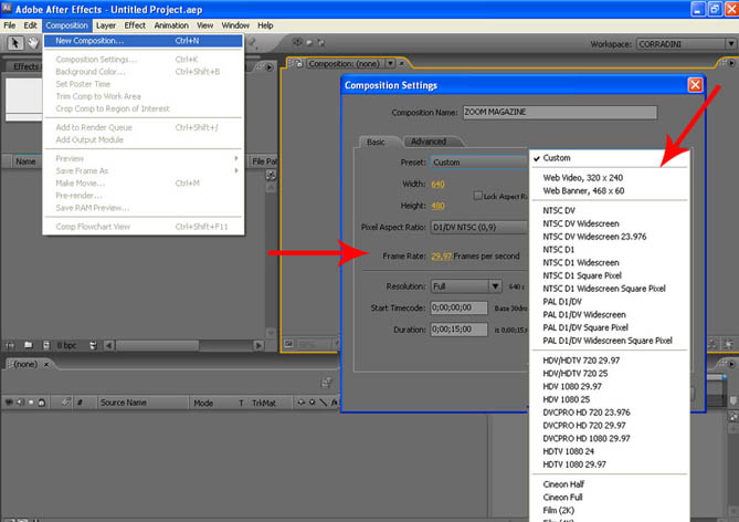 No campo PRESET é possível encontrar uma série de pré-configurações de composições, dentro das características mais utilizadas para cada área – por exemplo, WEB, TV com sistema NTSC, widescreen, standard etc.