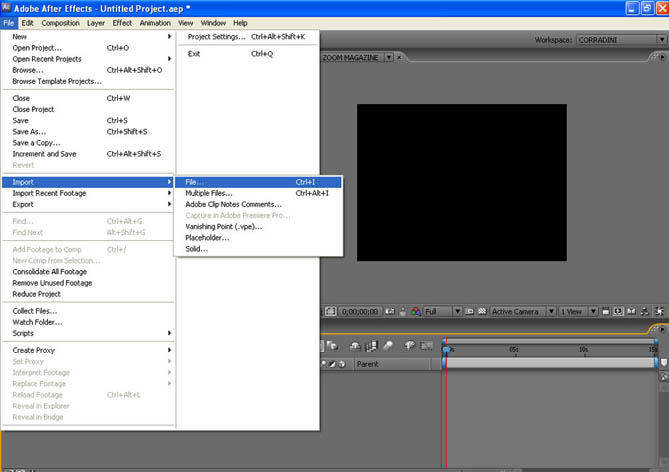 Note que, após a criação da composição, na janela Project, aparece um item COMPOSITION que é exatamente a composição recém-criada. Com a composition elaborada, já é possível iniciar o trabalho. O próximo passo é importar o arquivo (ou arquivos) que será utilizado no trabalho. Faremos essa importação em FILE/ IMPORT/ FILE: