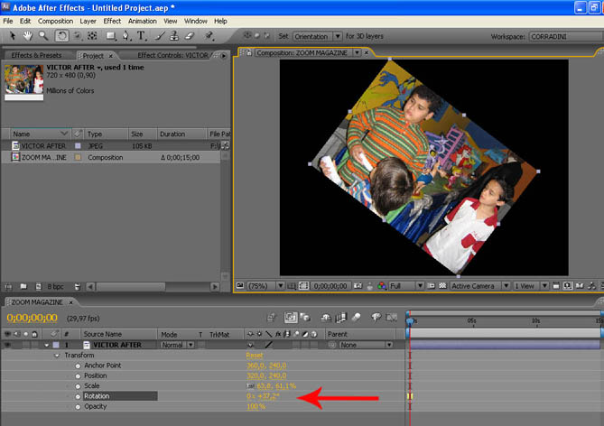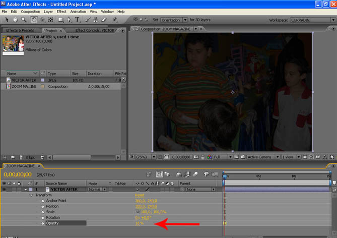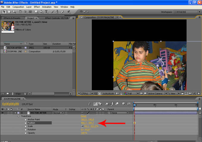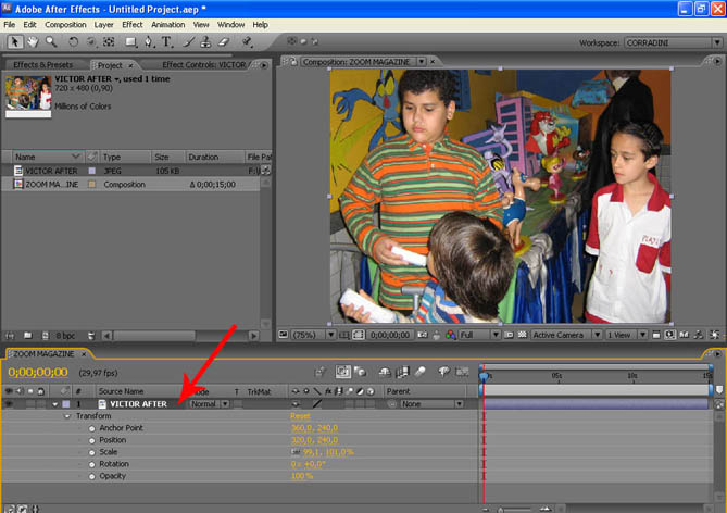 Para adicionar a imagem à composition, basta arrastá-la até lá. A imagem se acomodará no layer. Diferentemente dos programas de edição, aqui não há trilhas de vídeo e/ou áudio. Cada imagem, seja vídeo, foto ou desenho, é interpretada como uma camada (layer) independente (com todos os parâmetros, propriedades e efeitos fixos):