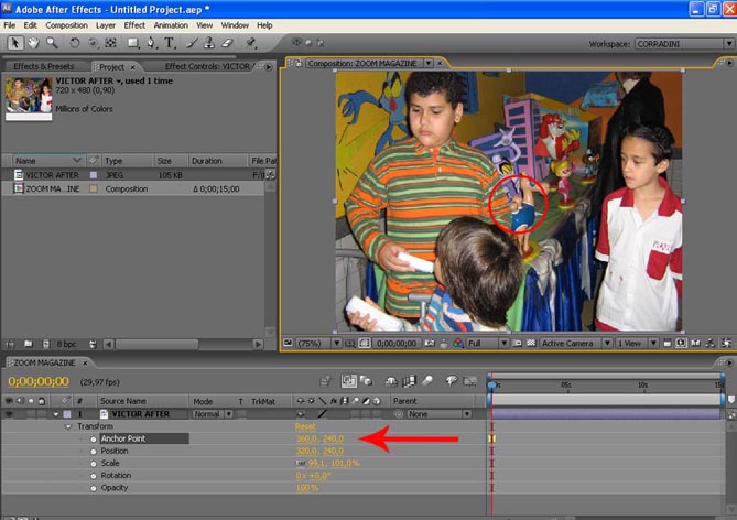 O ANCHOR POINT é o parâmetro responsável pelo ponto de Ancoragem da imagem. É ele que determina o eixo de rotação da imagem, o eixo de escala e até mesmo sua referência em relação à posição na tela de exibição. É representado por um ponto central da imagem: