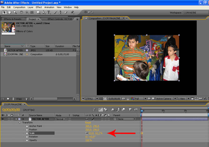 Já o SCALE (escala) é o parâmetro responsável por determinar o tamanho da imagem em relação à tela. O tamanho inicial será sempre 100% do tamanho original da imagem, independentemente do tamanho da composição. Pode ser configurado com os eixos “X” e “Y” (horizontal e vertical), amarrados ou separados: