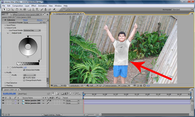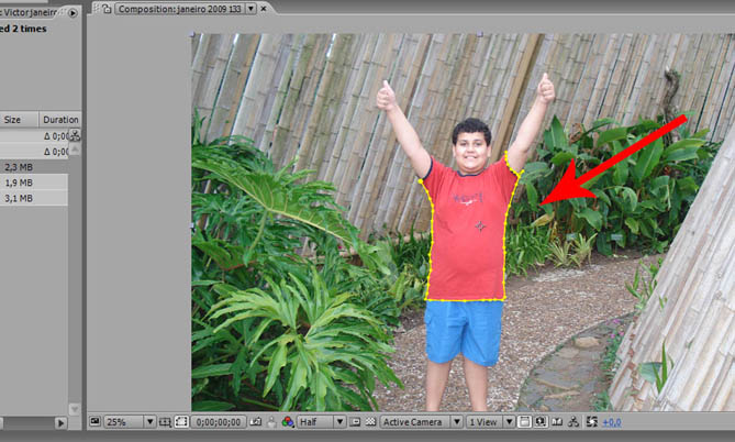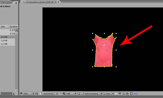 A composição foi criada com todas as informações da imagem utilizada, como tamanho (frame size), proporção de tela (aspect ratio) e duração. A intenção é fazer uma máscara ao redor da área onde a cor será trocada. Com isso, o restante da imagem desaparecerá.
