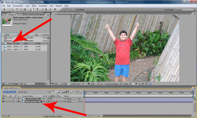 Para preencher a área transparente, arrastaremos para a Timeline a mesma imagem utilizada para o recorte. Para isso, basta pegá-la na janela “Project” e levá-la para baixo do layer 1, formando, assim, o layer 2: