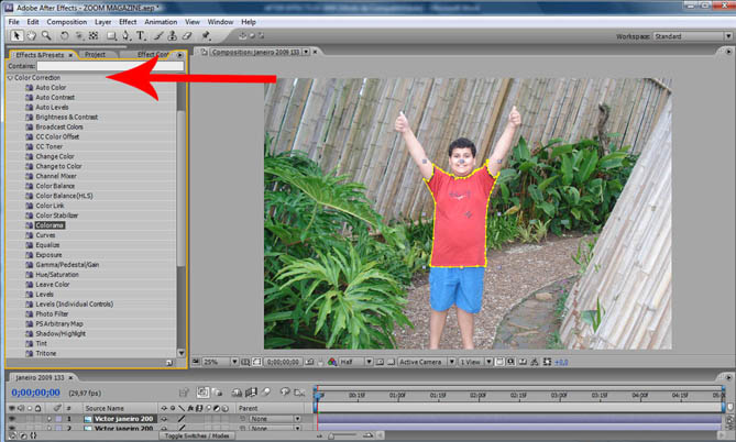 Todo o trabalho de correção será feito, agora, no layer 1, onde a máscara foi criada. Há diversos efeitos que trabalham com a correção ou alteração da imagem, operando diretamente sobre os canais de RGB (cor), saturação, brilho, contraste etc. Na janela “Effects & Presets”, na pasta “Color Correction”, é possível ter acesso a muitos deles. Neste exercício, utilizaremos o “Colorama”.