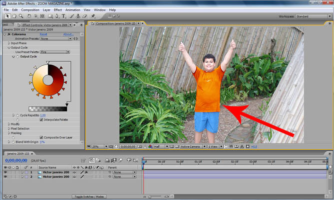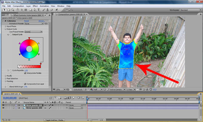 Esse efeito tem uma grande variedade de configurações, o que permite a alteração de cores em diversos níveis. Note que a área contornada pela máscara (a camiseta do menino) muda de cor conforme as configurações ou presets escolhidos: