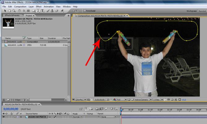 Criada a composição, o próximo passo é definir o caminho a ser percorrido pelo objeto. Nós o faremos utilizando a ferramenta “Pen Tool”. Com ela podemos criar máscaras (recortadas) e paths (caminhos). Vamos desenhar um caminho sobre a imagem em questão:
