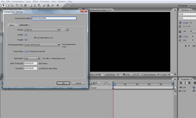 O primeiro passo é criar uma composição com as características desejadas. Em nosso exemplo, faremos uma composição em NTSC DV, ou seja: com 720X480 e com o aspect ratio D1/DV NTSC (0,9), como mostra a figura abaixo: