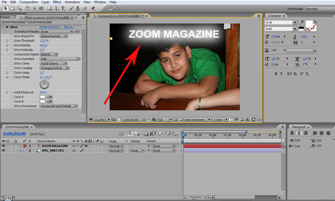 Utilizaremos, neste exemplo, o efeito “Glow”. Na janela EFFECTS E PRESETS, escolhemos este recurso e o adicionamos ao layer do texto. Feito isto, é só configurar o efeito para gerar o resultado programado: