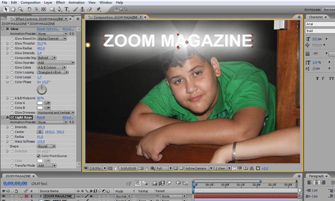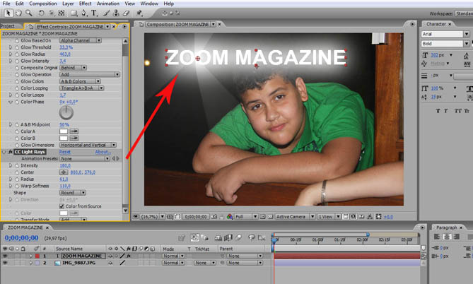 Agora, adicionaremos outro efeito e o combinaremos ao anterior, para gerar um efeito diferente. Utilizaremos o “CC Light Rays”, que cria raios luminosos: